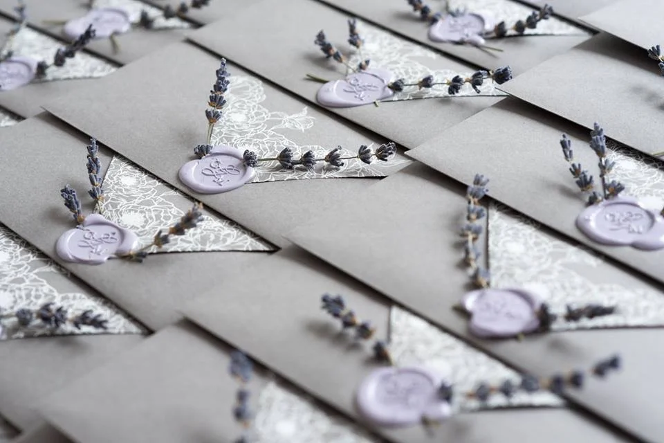 This invitation suite was inspired by lavender fields of the South of France in June. It features a pillowy grey letterpress and is complemented by lavender foil, envelopes in hues of grays with white ink, vintage postage and petite stems of dried lavender to elevate the experience. A laser cut bellyband of shimmery purple peonies ties it all together.